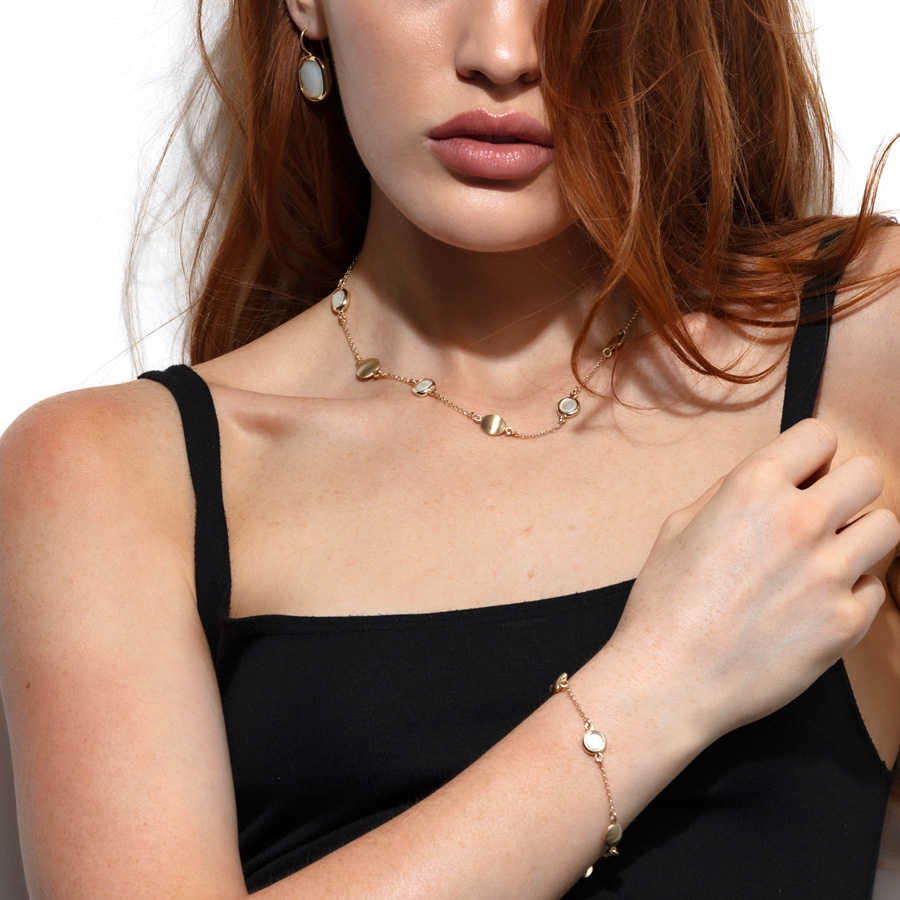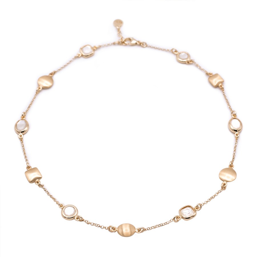 Girocollo in Argento 925‰ placcato oro giallo 23 Kt della collezione Mignon di Aquaforte. La maglia è una classica rolò dove si alternano saponette e madreperla con diverse forme, troviamo infatti elementi tondi, quadrati e ovali che si ripresentano nella collazione e creano infinite combinazioni di abbianamenti. La collana è lunga 42 cm con anellini di estensione fino a 45 cm e chiusura a moschettone.