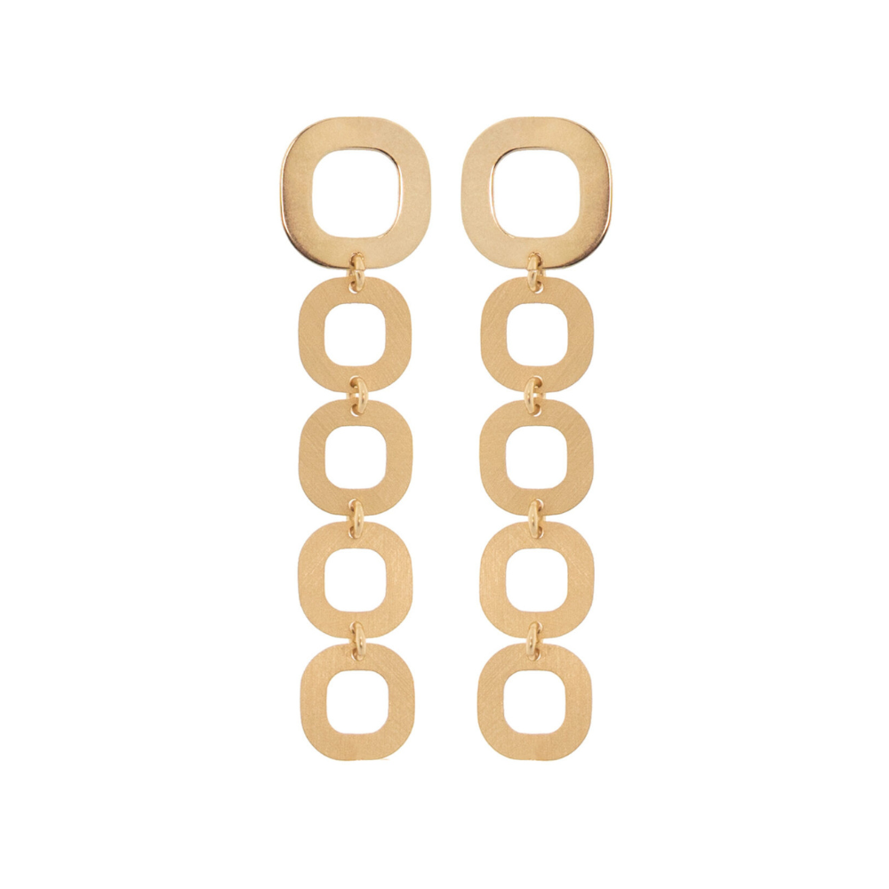 Orecchini pendenti in Argento 925‰ placcato oro giallo 23 kt, con lastre quadrate: la prima di dimensioni maggiori è lucida, seguita da quattro satinate. La lunghezza dell’orecchino è di 6.8 cm. La chiusura è pressione con perno e farfallina. Il gioiello è rivestito rivestimento con uno speciale trattamento che protegge dalla naturale ossidazione del metallo.